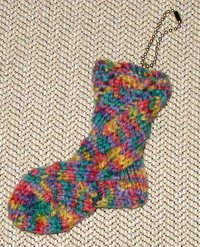 It's a mini sock about 2 inches from cuff to heel, using the Mermaid sock pattern from Lucy Neatby's "Cool socks, warm feet." I'm working on the pair, which will be released in a local geocache as a Travel Bug. It's going to be called "Hiking Socks" or "Itchy Feet," Hubby hasn't decided on a goal for it yet. My travel bug went from St Louis to Southern England, via Chicago and Florida. We're hoping this one gets a decent distance jumping from cache to cache.